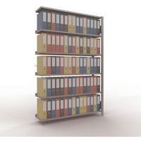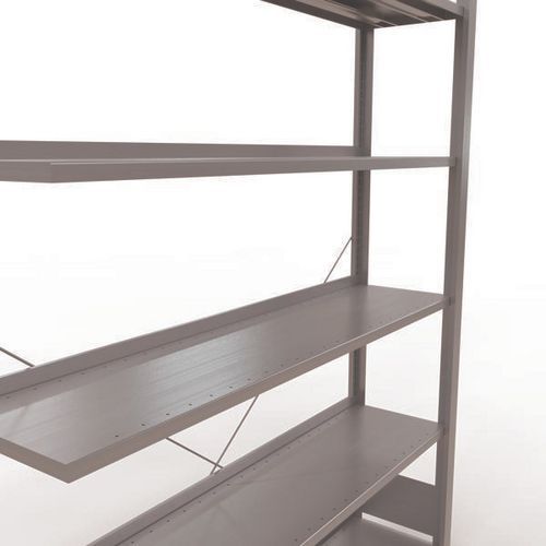 Rayonnage bureau de belle finition pour charge légère. Tablette pleine tôlée pour toutes natures d'objets. Montant plein tôlé sans perforation face avant. Barre de butée pour éviter la chute des objets. Pied de protection pour préserver les sols. Montage sans outils, par système de clip.