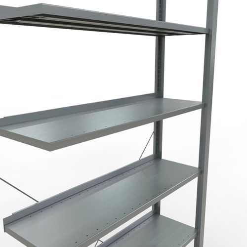 Rayonnage bureau de belle finition pour charge légère. Tablette pleine tôlée pour toutes natures d'objets. Montant plein tôlé sans perforation face avant. Barre de butée pour éviter la chute des objets. Pied de protection pour préserver les sols. Montage sans outils, par système de clip.