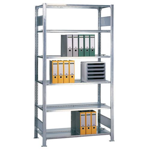 Rayonnage bureau de belle finition pour charge légère. Tablette pleine tôlée pour toutes natures d'objets. Butée centrale pour délimitation de chaque face. Montant plein tôlé sans perforation face avant. Pied de protection pour préserver les sols. Montage sans outils, par système de clip.