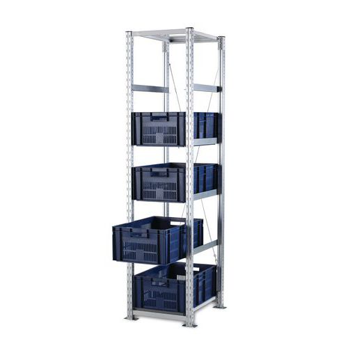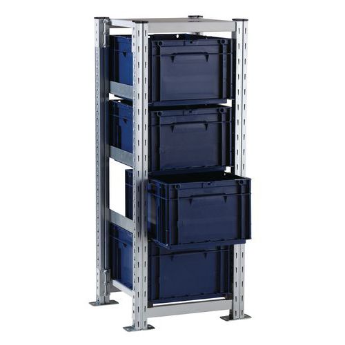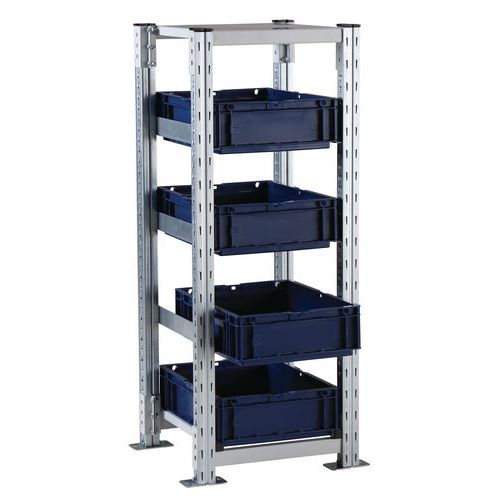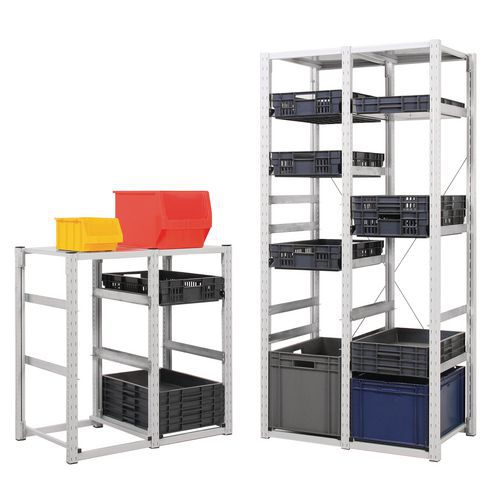 Rayonnage spécial bacs norme Europe 400x300 et 600x400 mm. Adapté pour des bacs norme Europe hauteur 230 mm maximum. Montage facile et extension aisée par l'ajout de module suivant. Croisillons non inclus. Transformez vos bacs de transport en bacs de stockage !