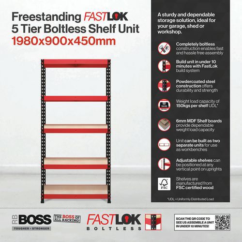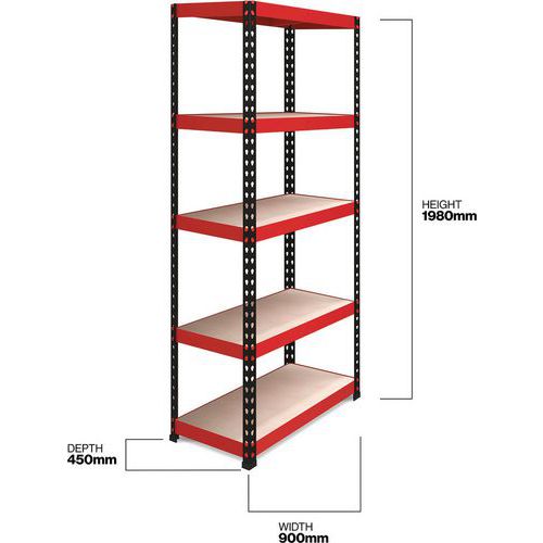 | Intitulé du produit | Rayonnage de garage RB Boss 150 kg 5 niveaux H x l x P 1980 x 900 x 450mm, Charge maxi par tablette: 150 kg |