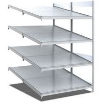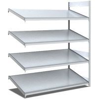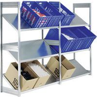 Rayonnage mobile léger acier galvanisé avec tablettes inclinées à butée avant offrant une très bonne visibilité des contenus stockés. Grâce à leur inclinaison de 30°, ces tablettes inclinées sont faciles d'accès, ce qui permet une préparation rapide et performante des commandes. Les dimensions de ce système de rayonnage sont compatibles avec des formats standards de conteneurs européens, qui peuvent ainsi y être aisément rangés. La surface lisse des tablettes inclinées permet également d'assurer un glissement optimal des marchandises vers l'avant, ainsi la préparation est uniforme et continue. Ces unités de rayonnage peuvent être montées rapidement, sans recours à des outils complexes ou à du personnel spécialisé. Les éléments suivants permettent une extension aisée du rayonnage, ils accroissent les espaces de stockage.