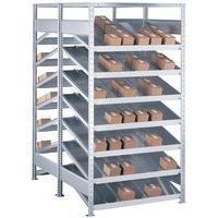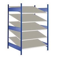 Rayonnage dynamique simple face avec tablette inclinée. Grande stabilité grâce aux nervures longitudinales et aux coins sertis. Rails de guidage latéraux assurant la protection anti-chute. Montage rapide de la structure, sans vis ni boulons.
