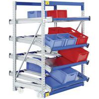 Rayonnage dynamique et ergonomique pour picking, adapté au système de gestion des stocks FIFO (1er entré/1er sorti). Plusieurs versions : système modulaire extensible avec l'ajout d'éléments suivants, module individuel fixe et/ou mobile. 4 ou 5 niveaux de rails à galets dont certains inclinés pour avancement parfait des produits et préparations facilitées. Rayonnage dynamique avec ajustement des niveaux et de l'inclinaison (initialement de 6,5° sur tablette inclinée). Version mobile équipée de 4 roulettes.