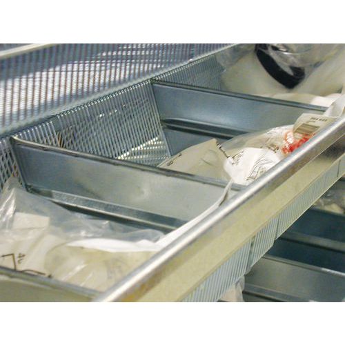 Rayonnage industriel acier de grande polyvalence. 3 niveaux panier + 2 niveaux tablette (agglo ou tôlée). Montants à double perforation pour utilisation des 2 côtés. Structure de grande stabilité : ne nécessite pas de croisillon. Combinaison avec d’autres rayonnages de gamme Easy-Fix Plus. Panier grillagé équipé de 5 séparateurs. Largeur du maillage : 1 mm. Hauteur avant panier : 12 mm. Hauteur arrière panier : 17 mm. Charge par niveau de panier : 21 kg.