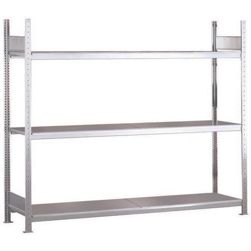 Solide rayonnage d'entrepôt à niveau plein acier tôlé. Stable sans croisillon, accessible d'un côté et de l'autre. Parfait en combinaison avec d’autres rayonnages Easy-Fix. Haute résistance à la corrosion avec finition acier galvanisé.