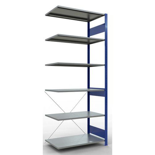 Système de rayonnage robuste et très complet avec belle finition peinte époxy, gris ou bleu. Tablettes pleines acier tôlé pouvant supporter des marchandises de multiples dimensions. Étagère industrielle facile et rapide à monter par emboîtement, sans outillage particulier. Extension de rayonnage aisée avec l'adjonction de 1 ou plusieurs éléments suivants.
