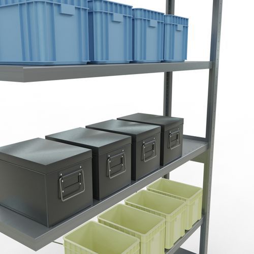 Rayonnage d'entrepôt robuste, finition galva ultra-résistante aux environnements humides. Tablettes pleines acier tôlé pouvant supporter des marchandises de multiples dimensions. Étagère industrielle facile et rapide à monter par emboîtement, sans outillage particulier. Extension de rayonnage aisée avec l'adjonction de 1 ou plusieurs éléments suivants. Distance entre les perforations : 25 mm. Hauteur de la première perforation : 50 mm.