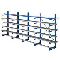 Rayonnage à bras simple et double face pour stockage à l'horizontale. Protection contre le roulement pour éviter la chute des matériaux. Extensible avec l'adjonction de 1 ou plusieurs éléments suivants. Rayonnage à bras de montage rapide grâce aux bras soudés. Montants dotés de 5 ou 10 bras fixes avec butée d'arrêt. Espacement entre 2 montants : 1200 mm. Espacement entre 2 bras : 1225 mm.