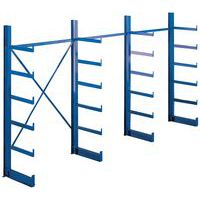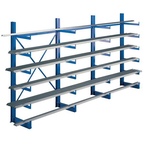 Rayonnage à bras simple et double face pour stockage à l'horizontale. Protection contre le roulement pour éviter la chute des matériaux. Extensible avec l'adjonction de 1 ou plusieurs éléments suivants. Rayonnage à bras de montage rapide grâce aux bras soudés. Montants dotés de 5 ou 10 bras fixes avec butée d'arrêt. Espacement entre 2 montants : 1200 mm. Espacement entre 2 bras : 1225 mm.
