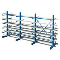 Rayonnage à bras simple et double face pour stockage à l'horizontale. Protection contre le roulement pour éviter la chute des matériaux. Extensible avec l'adjonction de 1 ou plusieurs éléments suivants. Rayonnage à bras de montage rapide grâce aux bras soudés. Montants dotés de 5 ou 10 bras fixes avec butée d'arrêt. Espacement entre 2 montants : 1200 mm. Espacement entre 2 bras : 1225 mm.