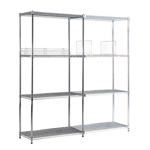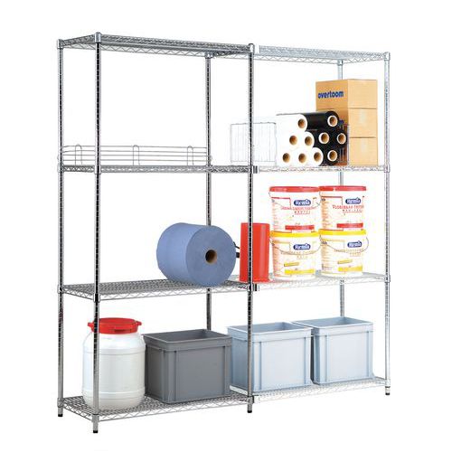 Système de rayonnage modulaire, hygiénique et esthétique. Tablette grillagée réglable en hauteur grâce aux clips vinyle. Grande stabilité sur tous supports grâce aux pieds réglables. Rayonnage de magasin facile à monter et d'extension aisée.