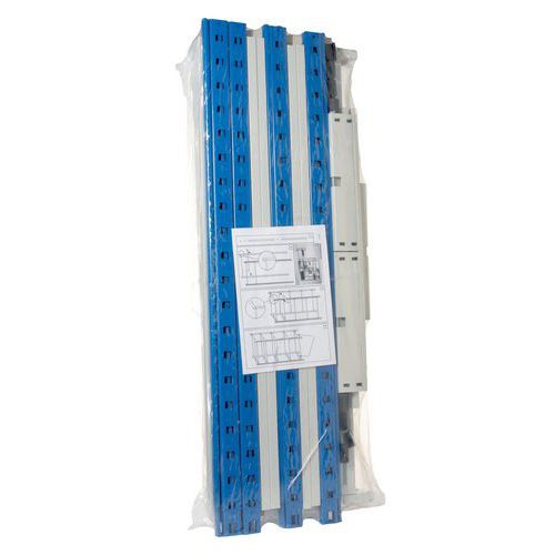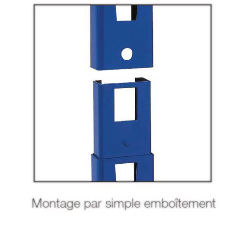 Montants en acier 12.5/10ème époxy bleu, section 40 x 20 x 10 mm, avec pied métal de 36 x 80 mm perforé au diamètre : 10 mm pour une éventuelle fixation au sol.