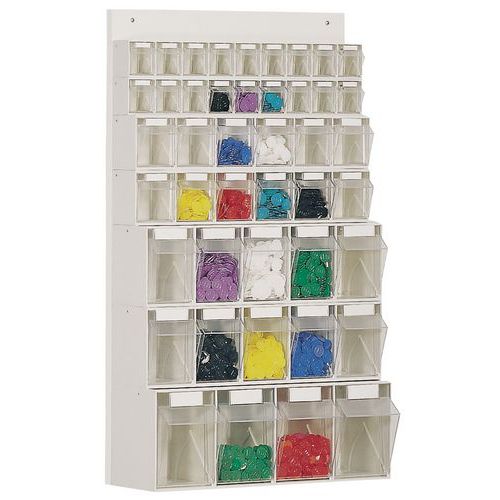 Avec 4 rangées de bacs inclinables transparents pour un aperçu clair du contenu.