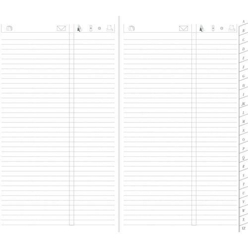 | Intitulé du produit | Répertoire alphabétique Silk, Réglure: Lignes, Type de reliure: Dos rigide, Coloris: Noir, Longueur: 240 mm |