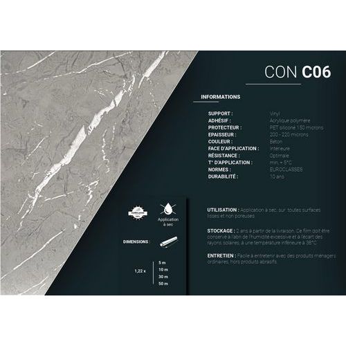 | Intitulé du produit | Revêtement adhésif béton C06 gris foncé, Type de film pour vitre: Film décoratif, Coloris: Gris foncé |
