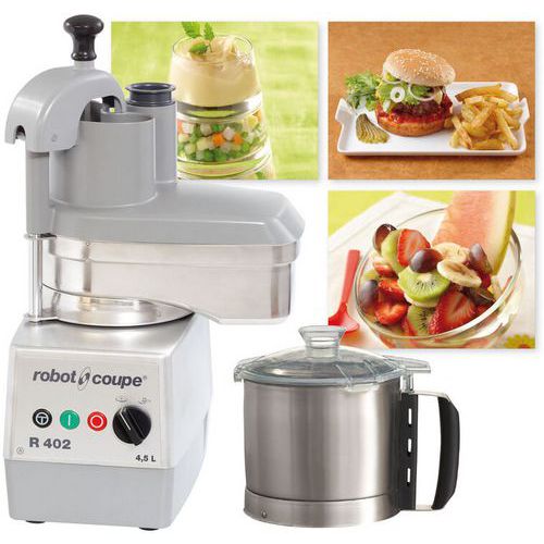 | Intitulé du produit | Robot coupe combiné cutter et coupe-légumes R402, Coloris: Blanc/gris, Vitesse: 1500 m/min, Puissance: 750 W |