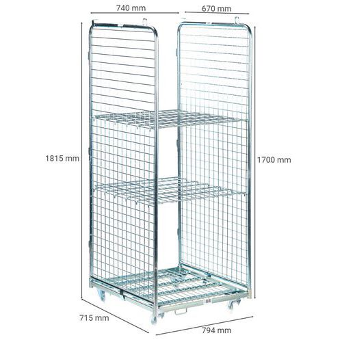 | Intitulé du produit | Roll conteneur 2 côtés et 2 tablettes, Force: 400 kg, Hauteur hors tout: 1815 mm, Longueur hors tout: 794 mm |
