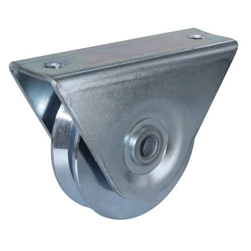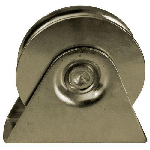 - Roue en acier zingué avec rainure en V et support extérieur pour un guidage optimal.