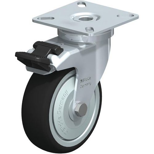 - Roulette d'appareil pivotante avec platine à visser et blocage stop fix en matière synthétique.