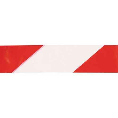 Ruban polyéthylène fabriqué par extrusion. Bonne résistance à la tension et à l'étirement avant rupture. Coloris rouge et blanc, alternés en diagonale. Ruban imprimé recto/verso avec encres à eau. Mandrin plastique noir. Absence de métaux lourds. Très bonne tenue dans le temps et respect de l'environnement. Fabriqué en France Garantie client : 10 ans