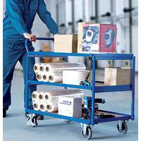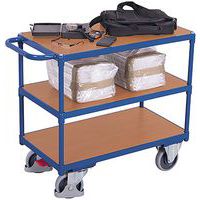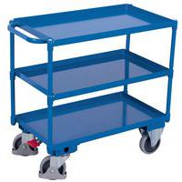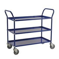 Chariot à 3 plateaux Construction mécano-soudé en tube d'acier, vissée Barre de poussée vers le haut Bacs en tôle étanches à l'huile et avec rebord 40 mm Revêtement: époxy bleu RAL 5010, en poudre