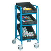 Chariot archive pour 7 ou 12 dossiers par étagère. Châssis en tube avec bords arrondis, convient pour la manutention de caisses ou boîtes d'archives. Étagères avec une épaisseur de 12 mm avec une capacité de 35 kg par étagère.