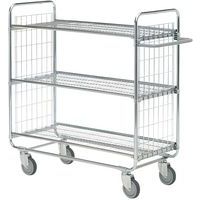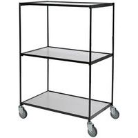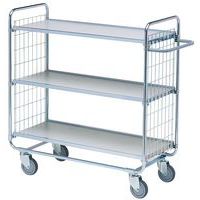 Chariot 3 plateaux, peut être adapté à des besoins différents en utilisant les plateaux et les poignées réglables en continu. Châssis tubulaire brillant galvanisé 22 mm, les plateaux sont de 12 mm, robustes, laminés couleur gris clair. Grace au bord du plateau et la bordure grillagée la charge reste fermement en place. Equipé de quatre roulettes pivotantes avec bande grise en caoutchouc.