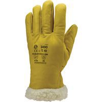 Cuir de vachette pleine fleur jaune. Fourrure synthétique en polyamide. Elastique de serrage sur la paume. Manchette de sécurité, longueur totale 32cm