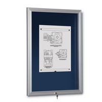 Vitrine avec cadre en profil aluminium anodisé argent. Étanche sur les 4 côtés avec ventilation naturelle pour éviter la condensation. Portes transparentes battantes pour les formats 4xA4 et 8xA8 et levante avec béquilles pour les formats supérieurs. Fond bleu en tôle d´acier électrozingué laquée pour un affichage par aimants. Serrure simple ou double à partir du format 8 A4, avec 2 clés par serrure. Montage facile par 4 points au travers de la tôle ou sur piètement. Porte démontable et vitre pouvant facilement être remplacée par l'utilisateur.