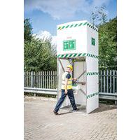 Douche de sécurité à réservoir 350 L isolé avec lave-yeux/visage. Adapté à une utilisation dans des environnements dangereux et non dangereux. Fourni un débit constant d'eau potable pendant plusieurs minutes, même lorsqu'il n'y a pas d'alimentation en eau du réseau. Isolation thermique maintenant une température constante de l'eau dans le réservoir. Activation de la douche facile via par la barre anti-panique.