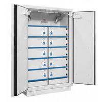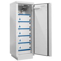 Armoire haute, une porte, dotée de 5 casiers individuels avec fermeture à clefs, pour le stockage et la charge de batteries lithium-ion. Armoires équipées d'un extincteur. Armoire compartimentée pour le stockage et la charge de batteries lithium. Résistante au feu 90 minutes (feu extérieur vers l'intérieur) et 180 minutes (feu intérieur vers l'extérieur).