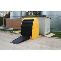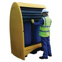 Box de stockage rigide double paroi résistant à la corrosion chimique. Accès facile des 2 côtés via rideaux coulissants côtelés, souples et résistants. Manutention à vide par transpalette ou chariot élévateur. Bonne hauteur interne.