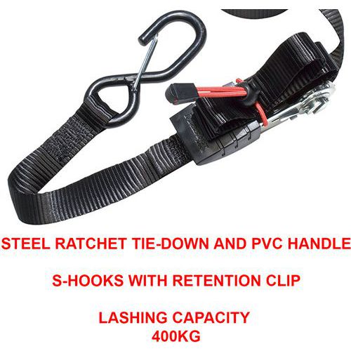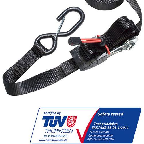 | Intitulé du produit | Sangle à cliquet, Longueur: 4250 mm, CMU: 400 kg, Largeur: 25 mm, Coloris: Noir, Sangle matériau: Polyester |