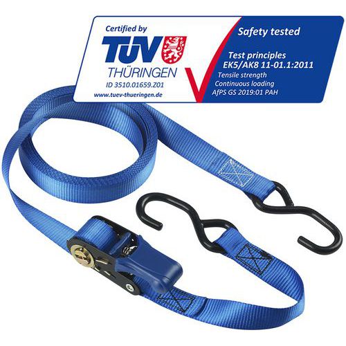 | Intitulé du produit | Sangle à cliquet Master Eco, Longueur: 5000 mm, CMU: 300 kg, Largeur: 25 mm, Coloris: Bleu |