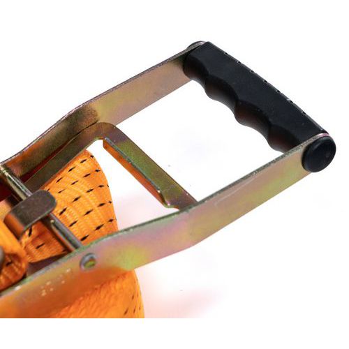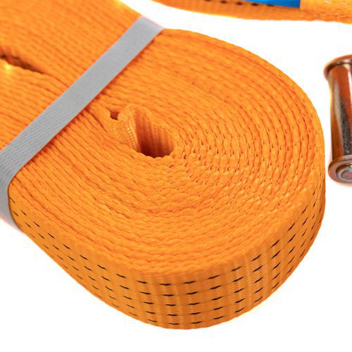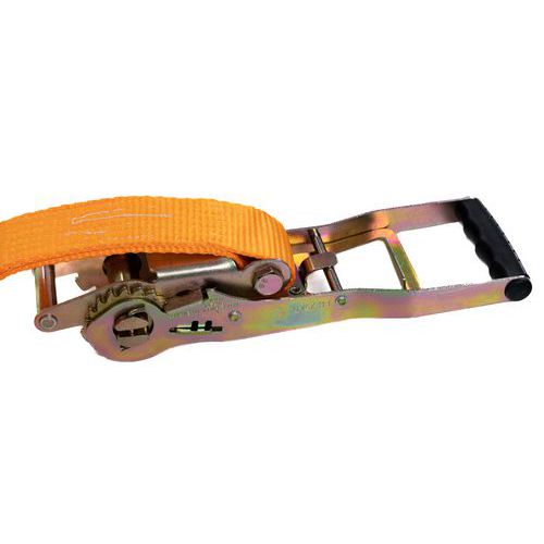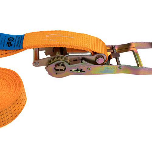 Sangle d'arrimage 1% polypropylène à cliquet tendeur ergonomique. Idéale pour maintenir vos chargements en toute sécurité. Coefficient de sécurité 2, norme EN12195-5.
