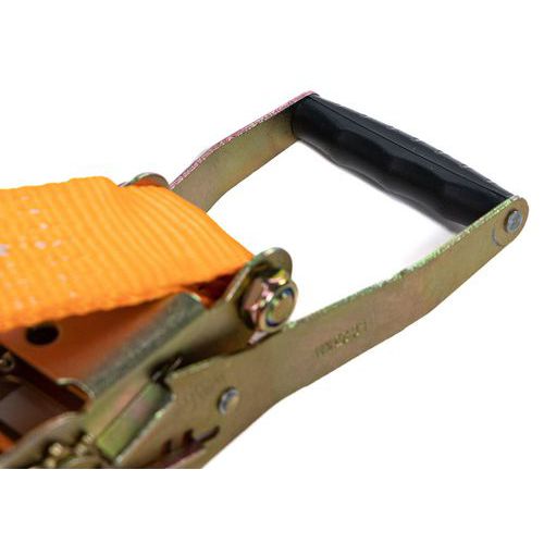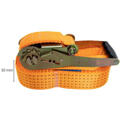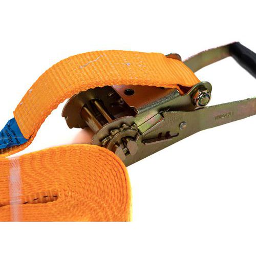 Sangle d'arrimage 1% polypropylène à cliquet tendeur ergonomique. Idéale pour maintenir vos chargements en toute sécurité. Coefficient de sécurité 2, norme EN12195-5.