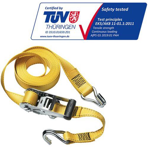 | Intitulé du produit | Sangles à cliquet avec crochets en J, Longueur: 4500 mm, CMU: 1250 kg, Largeur: 35 mm, Coloris: Jaune |