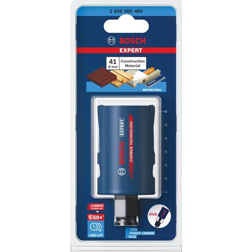 Scie trépan Power Change carbure multiconstruction - Bosch Dure jusqu'à 50 fois plus longtemps qu'une scie trépan HCS dans des matériaux durs Extrême longévité garantie par Bosch Carbide Technology (technologie carbure). À utiliser avec le montage sans clé Bosch Power Change Plus : offrant précision et robustesse. Idéale pour percer des trous jusqu'à 60 mm de profondeur, par exemple pour la pose de gaines destinées aux fils électriques et aux tuyaux d'eau potable et d'eaux usées des plombiers, ou encore pour percer des trous pour des prises, des interrupteurs, des boîtiers de dérivation, un éclairage encastré, des alarmes incendie, des détecteurs de présence ou bien pour les conduits de climatisation ou de soufflage. Idéale pour les électriciens et les plombiers : durable et très polyvalent.