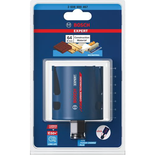 Scie trépan Power Change carbure multiconstruction - Bosch Dure jusqu'à 50 fois plus longtemps qu'une scie trépan HCS dans des matériaux durs Extrême longévité garantie par Bosch Carbide Technology (technologie carbure). À utiliser avec le montage sans clé Bosch Power Change Plus : offrant précision et robustesse. Idéale pour percer des trous jusqu'à 60 mm de profondeur, par exemple pour la pose de gaines destinées aux fils électriques et aux tuyaux d'eau potable et d'eaux usées des plombiers, ou encore pour percer des trous pour des prises, des interrupteurs, des boîtiers de dérivation, un éclairage encastré, des alarmes incendie, des détecteurs de présence ou bien pour les conduits de climatisation ou de soufflage. Idéale pour les électriciens et les plombiers : durable et très polyvalent.