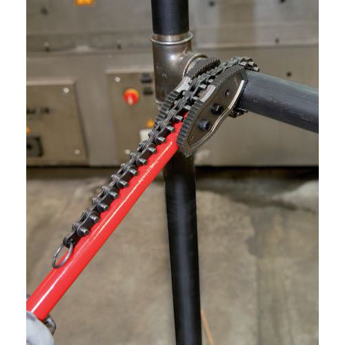 Serre-tube robuste destiné au serrage énergique des conduites d’eau et canalisations dont l’accès est difficile (tranchées eau, gaz, pipeline) dans les industries chimiques et pétrolières, chantiers navals.
