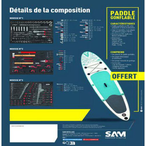 | Intitulé du produit | Servante 6 tiroirs maintenance 224 outils + paddle offert, Charge maxi: 950 kg, Charge maxi par tiroir: 30 kg |