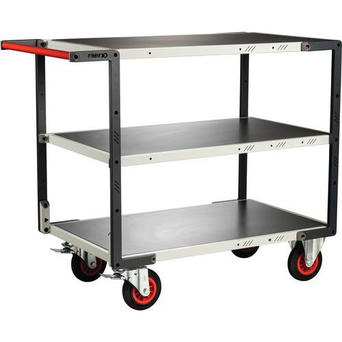 Servante flat-pack roues CC - 1095x540x980mm - FIMM. Plateaux encastrés. Poignée à hauteur ergonomique, en tube Ø 28 mm pour une bonne prise en main. Poignée horizontale permettant de positionner des charges débordantes du Plateau. Roues caoutchouc : adaptées aux sols lisses. 2 roues fixes + 2 pivotantes à frein conformément à la norme EN 1757. Produit livré démonté. Forfait montage en option. Charge maximum par Plateau supérieur et intermédiaire : 140 kg.