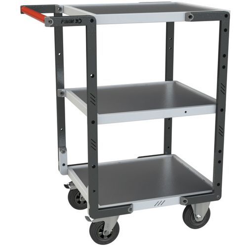 Servante flat-pack roues CC - 795x540x945mm - FIMM. Plateaux encastrés. Poignée à hauteur ergonomique, en tube Ø 28 mm pour une bonne prise en main. Poignée horizontale permettant de positionner des charges débordantes du Plateau. Roues caoutchouc : adaptées aux sols lisses. 2 roues fixes + 2 pivotantes à frein conformément à la norme EN 1757. Produit livré démonté. Forfait montage en option. Charge maximum par Plateau supérieur et intermédiaire : 90 kg.