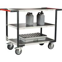 Conception robuste avec châssis en tube de 35 × 20 mm. renforts sous plateau et plateaux tôle encastrés. Dossier fixé au plateau par 3 points garantissant la longévité de l’assemblage dans le temps. Conception évolutive permettant de rajouter un plateau dans un second temps. Surface de pose optimisée grâce à une poignée positionnée dans l’alignement du plateau. Plateaux en tôle galvanisée réversible (face avec ou sans rebord de 16 mm) d’épaisseur 2 mm adaptés aux milieux corrosifs. Charge utile du plateau supérieur (et intermédiaire) limitée à 140 kg. Poignée ergonomique à hauteur, en tube Ø 28 mm pour une bonne prise en main. Pour faciliter le chargement, les montants avant peuvent être reculés de façon symétrique. Les doubles poignées permettent une manipulation dans les 2 sens, idéal dans les espaces restreints. 2 roues fixes + 2 pivotantes à frein conformément à la norme EN 1757. Conception démontable facilitant la réparation.