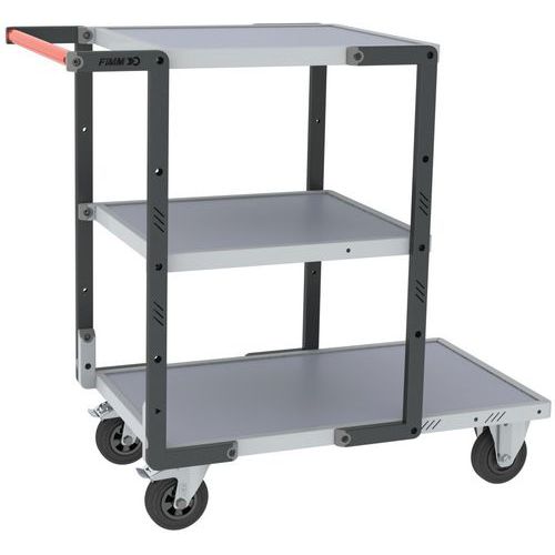 Servante montée roues CC - 1095x540x980mm - FIMM. Plateaux encastrés. Poignée à hauteur ergonomique, en tube Ø 28 mm pour une bonne prise en main. Poignée horizontale permettant de positionner des charges débordantes du Plateau. Roues caoutchouc : adaptées aux sols lisses. 2 roues fixes + 2 pivotantes à frein conformément à la norme EN 1757. Produit livré monté. Charge maximum par plateau supérieur et intermédiaire : 140 kg.