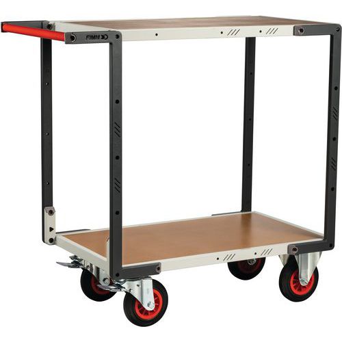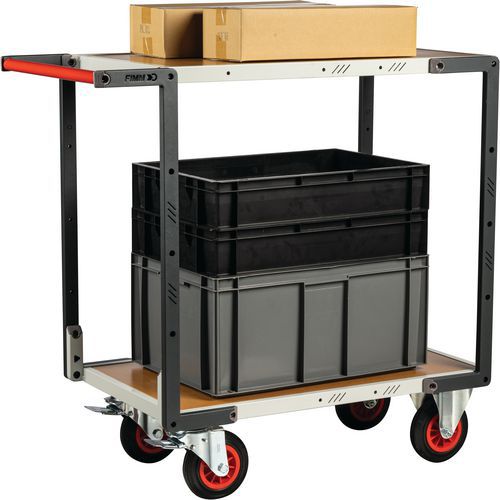 Servante montée roues CC - 1095x540x980mm - FIMM. Plateaux encastrés. Poignée à hauteur ergonomique, en tube Ø 28 mm pour une bonne prise en main. Poignée horizontale permettant de positionner des charges débordantes du Plateau. Roues caoutchouc : adaptées aux sols lisses. 2 roues fixes + 2 pivotantes à frein conformément à la norme EN 1757. Produit livré monté. Charge maximum par plateau supérieur et intermédiaire : 140 kg.