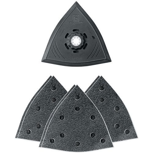 Plaque de support en plastique pour éviter les dommages et les marques sur la pièce à travailler. Contenu de la livraison : 1 grand patin de ponçage triangulaire perforé (longueur d’arête 130 mm), resp