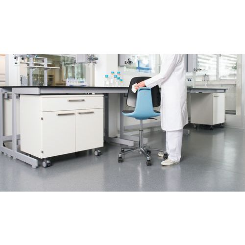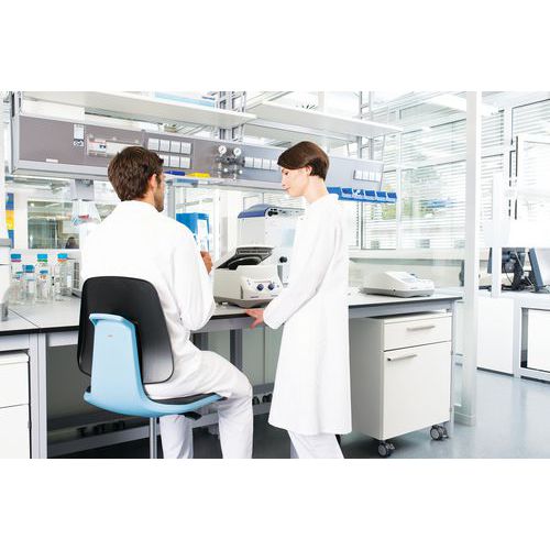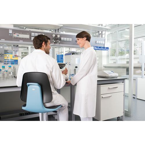 Siège d'atelier compatible salles blanche. Fonctions innovatrices ergonomiques : Suit tous les mouvements du corps. 3D-Flex fonctions en bord du siège et dans le dossier Maniement aisé grâce aux poignées intégrées. Parfait pour votre laboratoire. Lavable et résistant aux désinfectants.