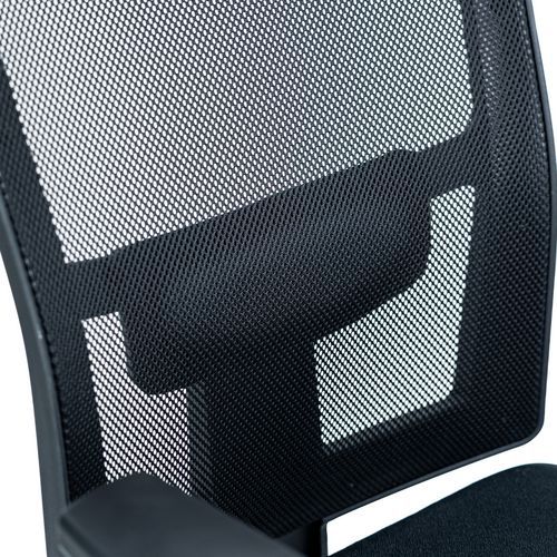 Mécanisme synchrone avec réglage de l'intensité, blocage multipositions et système anti-retour. Mousse polyéther épaisseur 5 cm sur assise. Piètement polyamide noir.